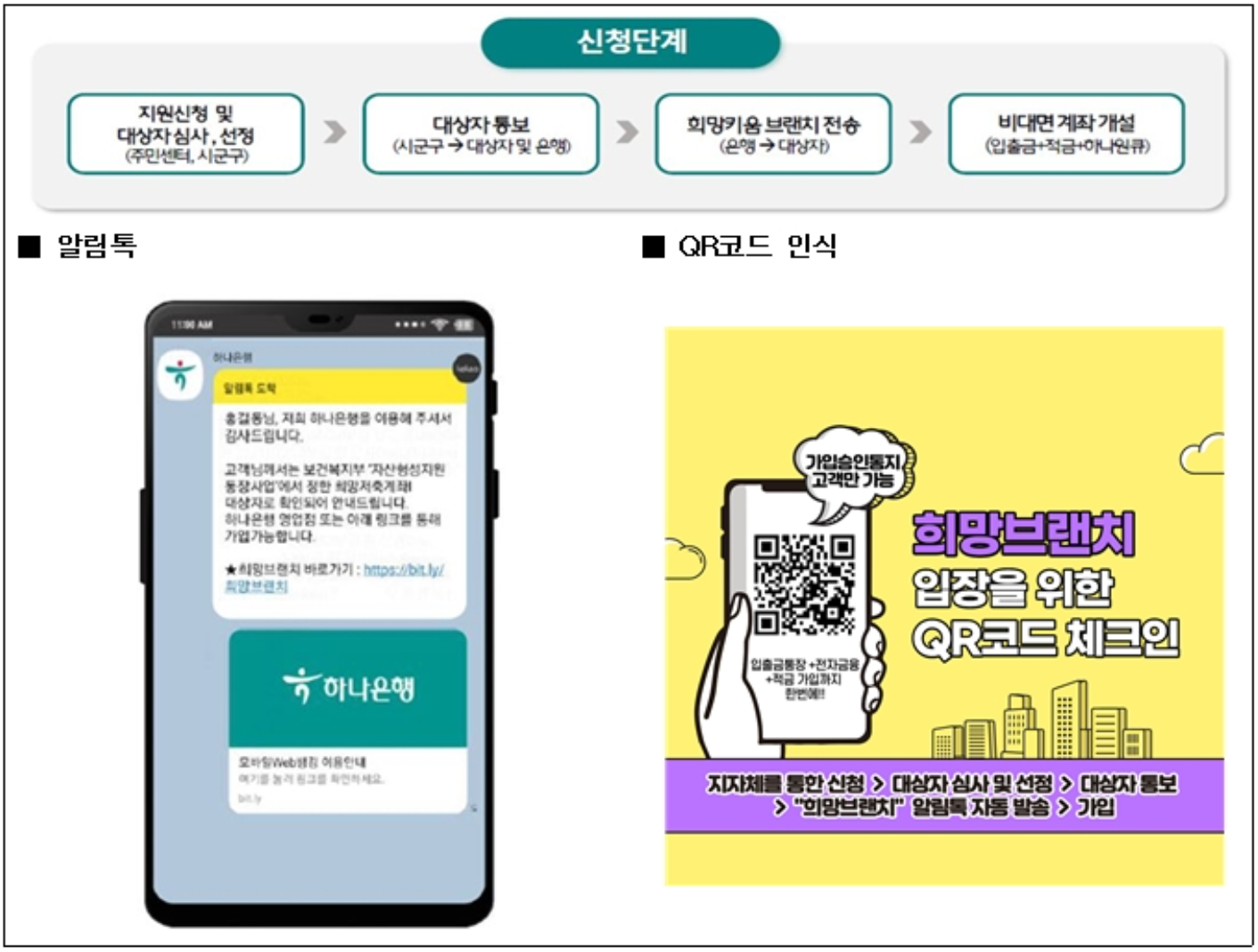 - 하나은행 희망브랜치 전송 → 알림톡 내 링크 접속 후 절차에 따라 가입 진행